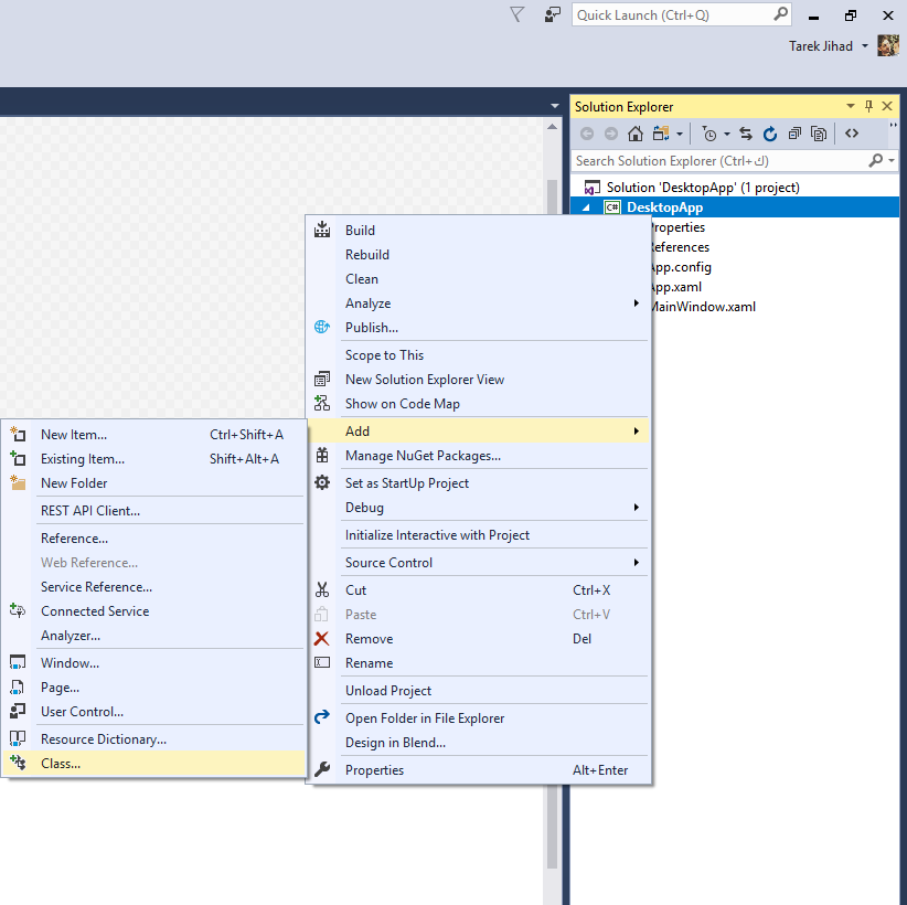 1. من نافذه Solution Explorer نضغط على اسم المشروع بالزر الأيمن ثم نختار Add ثم Class